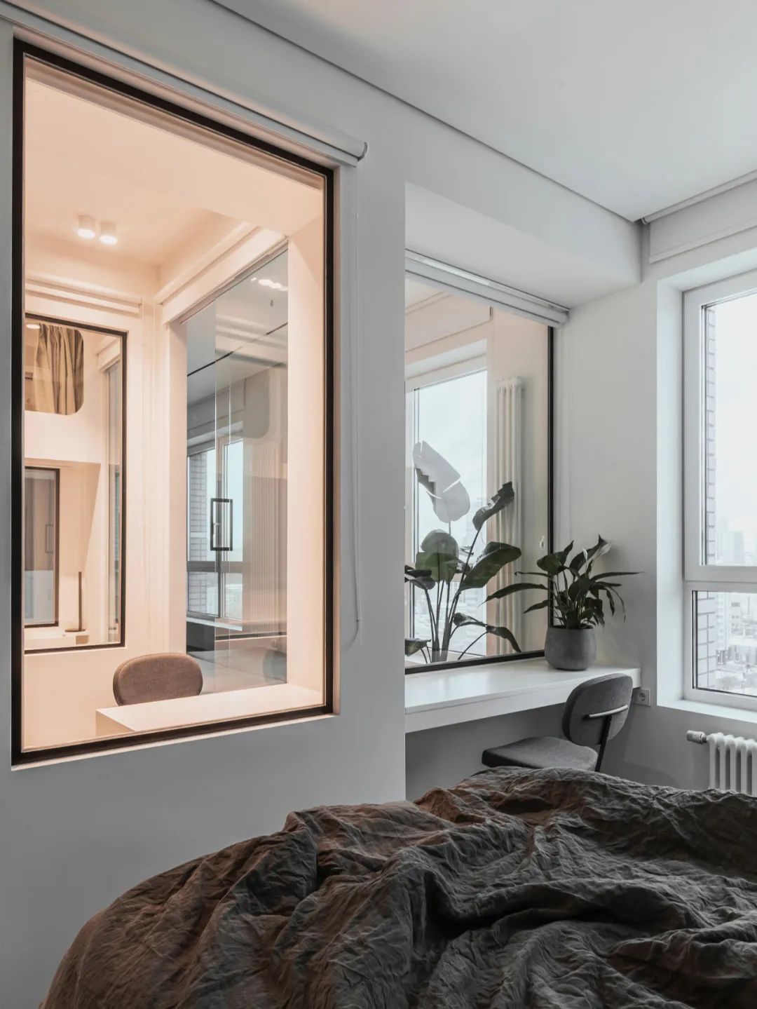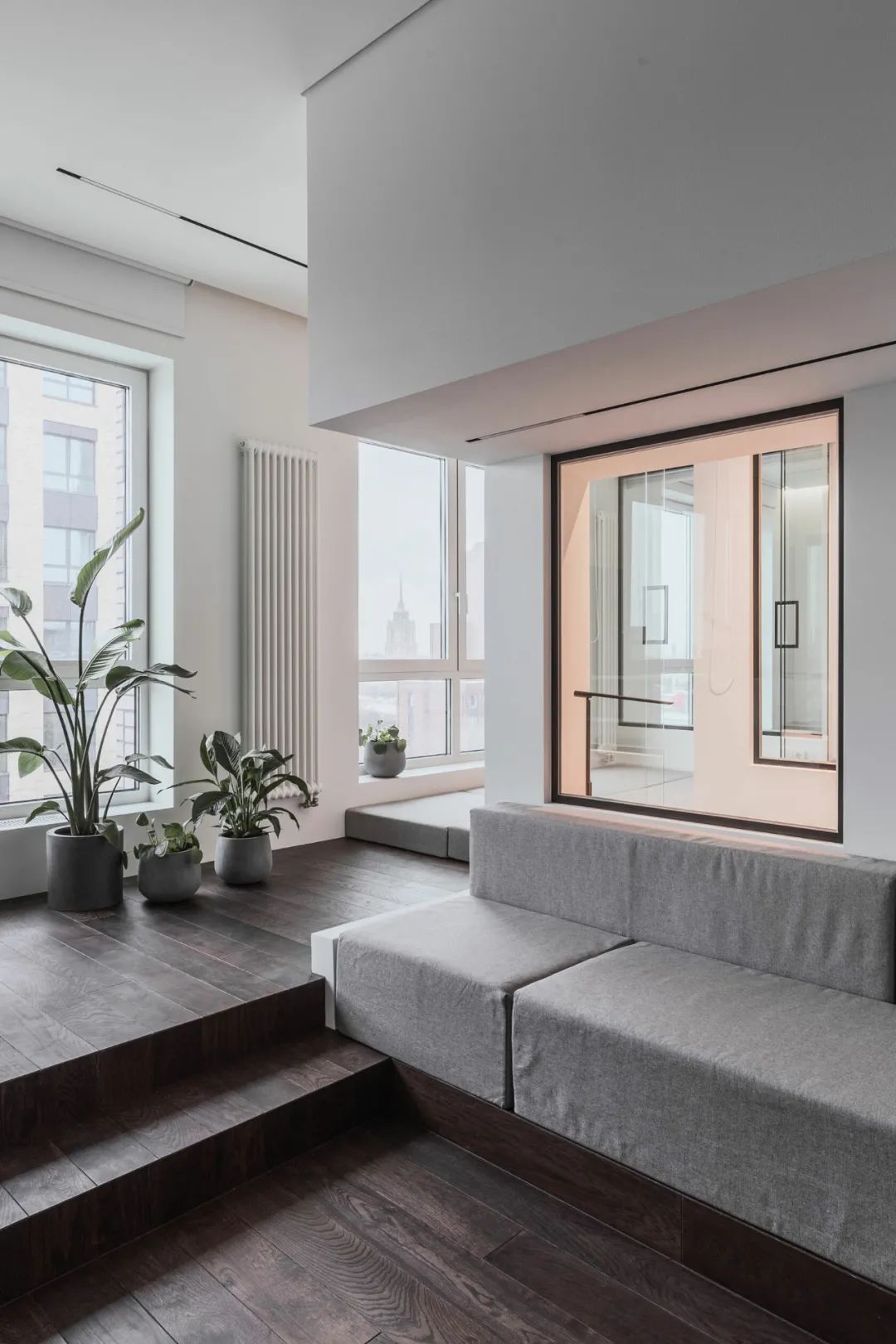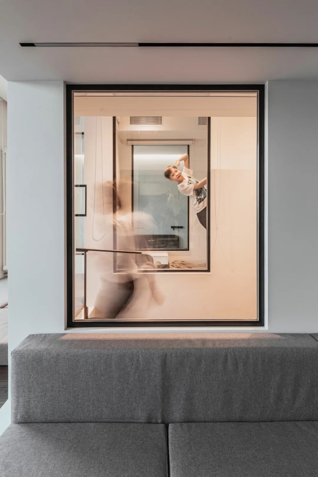 中央體量劃分了公寓的整個空間,包括兩個兒童房、一個客廳和一個休閑區(qū)。在內(nèi)部隔斷上設置了窗戶,因此公寓在所有房間中都是可見的。所有室內(nèi)窗戶都配備了卷簾,這樣你就可以完全將你的區(qū)域與其他人隔離開來。為了增強這些窗戶的隔音效果,在具有U形截面的復合鋁型材中使用了Triplex6+4。