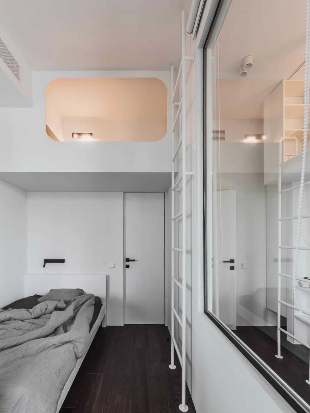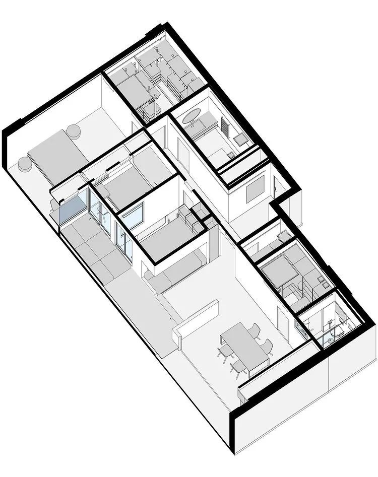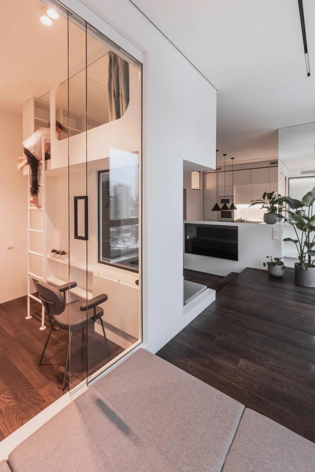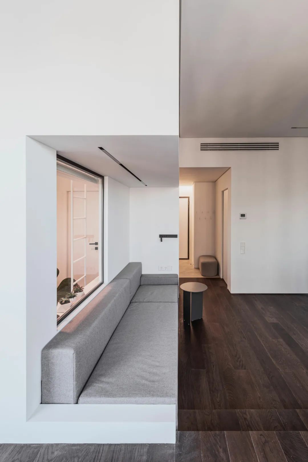 中央體量劃分了公寓的整個空間,包括兩個兒童房、一個客廳和一個休閑區(qū)。在內(nèi)部隔斷上設置了窗戶,因此公寓在所有房間中都是可見的。所有室內(nèi)窗戶都配備了卷簾,這樣你就可以完全將你的區(qū)域與其他人隔離開來。為了增強這些窗戶的隔音效果,在具有U形截面的復合鋁型材中使用了Triplex6+4。