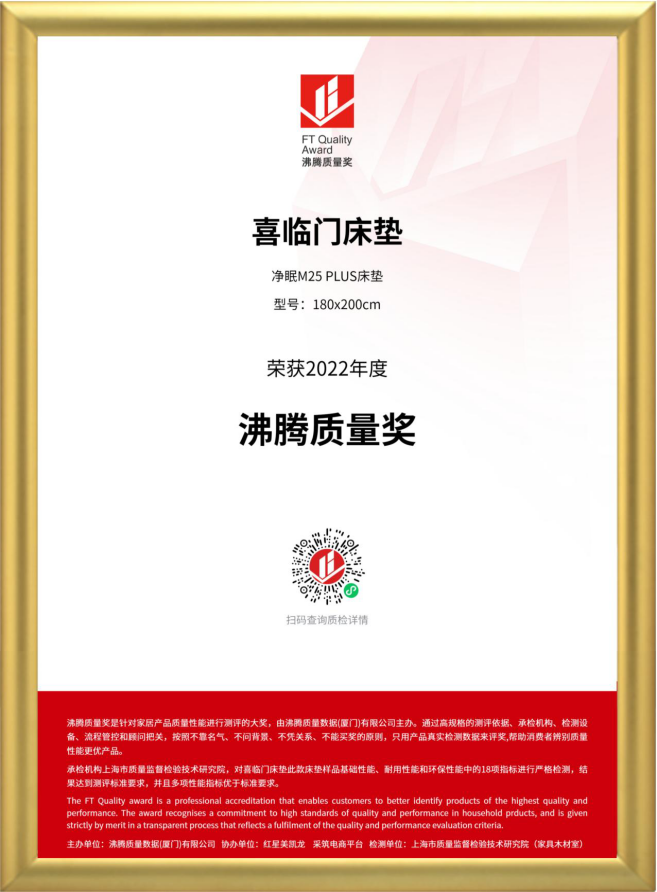 近日,由中國質量認證中心指導,沸騰質量數據主辦的2022年度沸騰質量獎重磅公布,喜臨門凈眠M25 Plus彈簧軟床墊憑借著過硬的產品品質與卓越的技術實力,在眾多參評產品中再次脫穎而出,連續兩年斬獲“沸騰質量獎”。